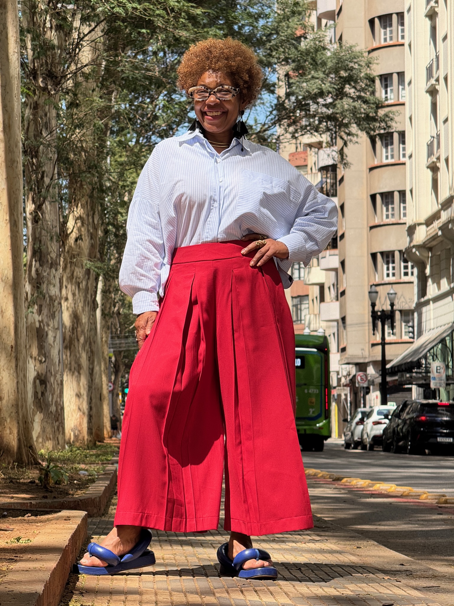 A calça apresentada possui um modelo de estilo amplo e fluido, com pregas elegantes que oferecem um toque sofisticado. Confeccionada em tecido Marante. O design é de cintura alta, com um acabamento que se ajusta de forma confortável, com ziper e elastico na parte traseira. As pernas da calça são largas e com bastante movimento, proporcionando um visual descontraído e moderno. Essa peça é ideal para quem busca conforto sem abrir mão de estilo.