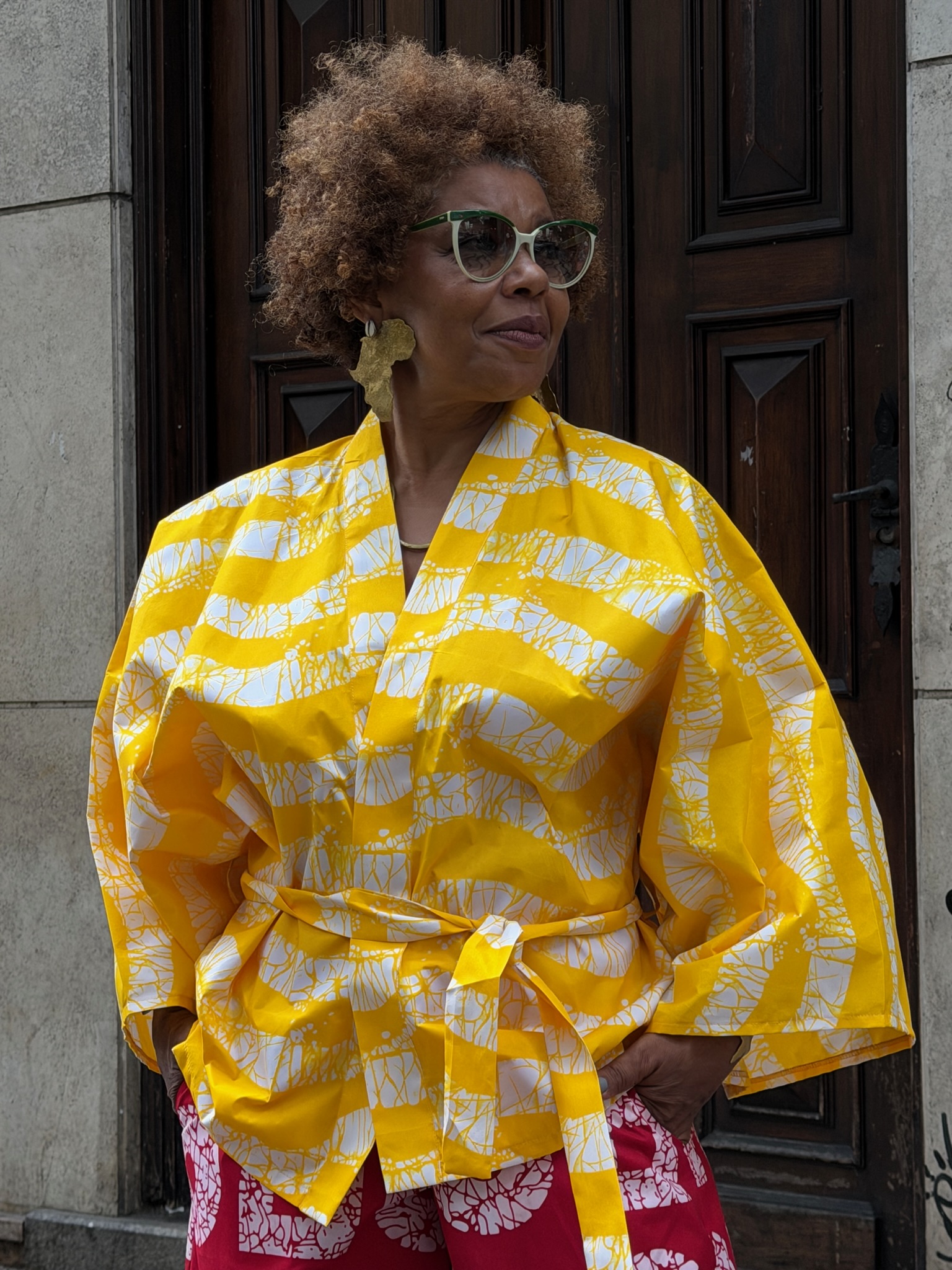 Kimono acompanha a faixa, levemente alongado, com destaque para as estmpas e cores vibrantes que acompanham o formato moderno e elegante.