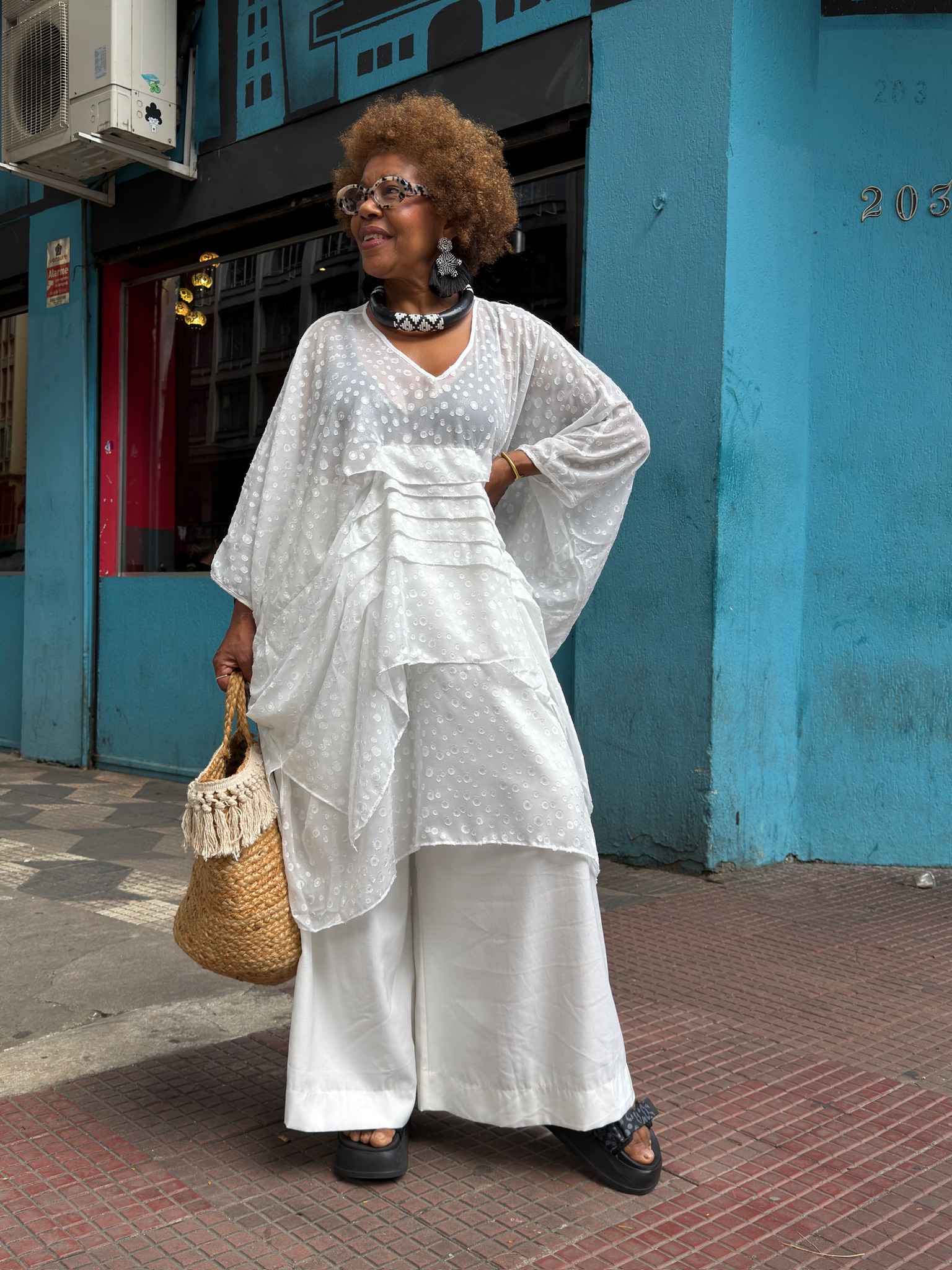 Vestido com modelagem ampla, solta, destacando mangas largas e recortes frontais garantem fluidez e movimento. Confeccionado em viscose.