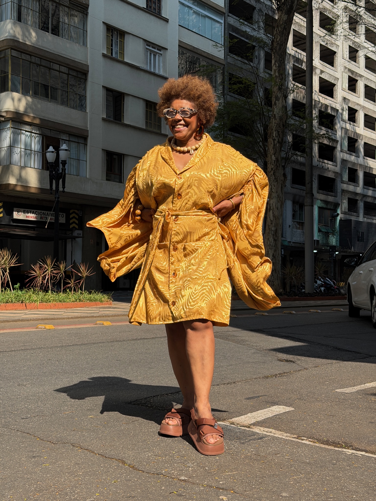 Túnica estampada com modelagem ampla, confeccionada em tecido leve e fluido que traz movimento ao look. A túnica conta com gola tradicional, abotoamento frontal, e mangas longas com caimento solto, que criam um visual moderno e elegante. A cintura é marcada por faixa ajustável, permitindo adaptar o shape ao corpo. O comprimento é midi curto, com leve assimetria na barra. Um modelo versátil e estiloso, ideal para quem busca conforto aliado a personalidade.